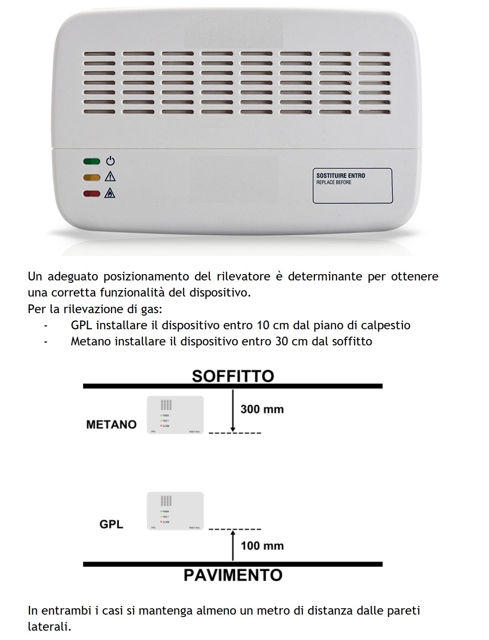 Dispositivo radio compatibile con la linea Long Range, progettato per la rilevazione di gas GPL o Metano in ambienti domestici alimentato direttamente a 230 VAC pertanto non richiede alimentatori esterni o batterie.